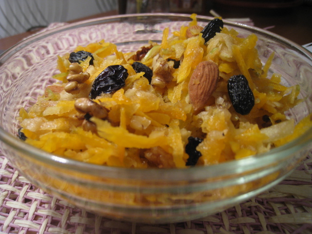 Тыкву и яблоки берем примерно в равных долях, трем на терке. Сразу же поливаем немного маслом, чтобы яблоки не окислились. Добавляем по вкусу лимонный сок, орешки и изюм, перемешиваем. Я ем без меда, но если хотите послаще, можно его немного добавить.
