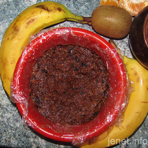 В первую очередь выстилаем пленкой удобную емкость, в этом рецепте — небольшой тазик диаметром около 20 см. и отовим корж из сухофруктов и орехов — процесс подготовки подробно описан в рецепте торта «Дружба народов».
