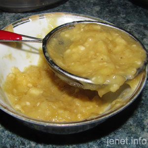Банан разминаем вилочкой в крем. Если он не совсем мягкий, то можно комочки пропустить через сито, но и это не обязательно. Крем будем сладким, но при желании можно добавить 1 чайную ложечку меда. Если вы наоборот любите легкие, а не приторные вкусы, то добавьте в крем половинку яблока, натертого на терке, не пожалеете! Также добавляем 2 чайн. ложки какао, хорошенько перемешиваем. Заливаем кремом фруктовый слой.