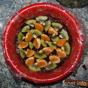 На корж выкладываем кусочки фруктов: киви, мандарина (а можно взять яблоки, груши, любые ягоды и т.д.)