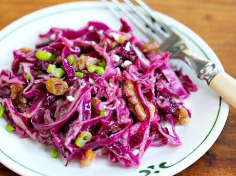Оригинальный теплый горчичный соус с пикантной красной капустой — в этом салате сочетаются все вкусы: фета дает соленый, изюм — сладкий, винный уксус и сама капуста — кислинку. Очень богатый пикантный салат.