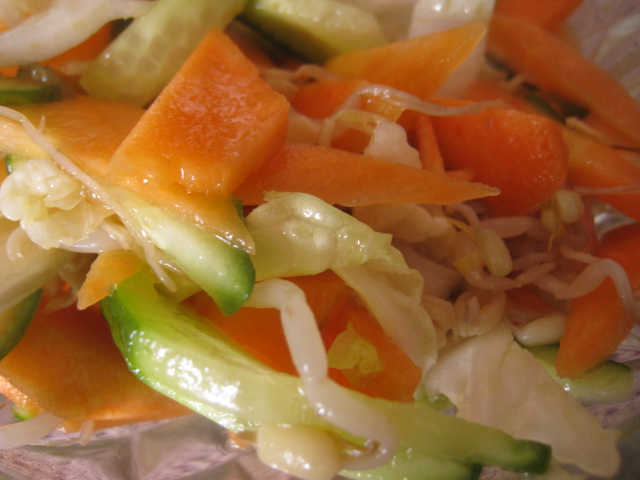 Пекинскую капусту нарезаем довольно большими кусочками. Морковь и огурцы нарезаем плоскими треугольниками. Добавляем пророщенный маш (я обычно ленюсь заранее проращивать маш и покупаю готовый салат у кореянок :)), солим, поливаем хорошенько маслом, перемешиваем и кушаем :)