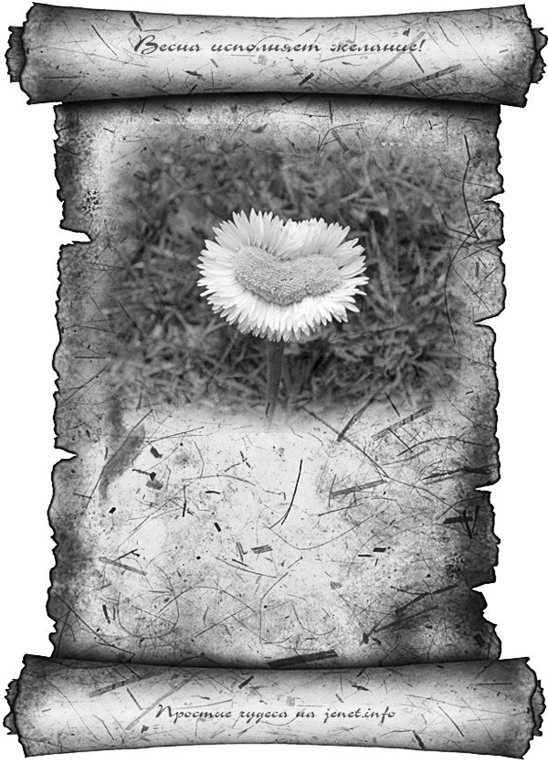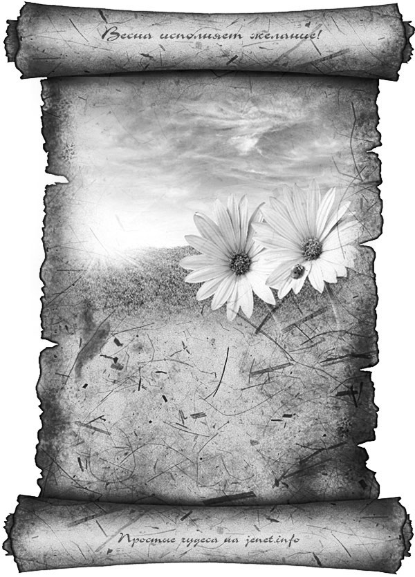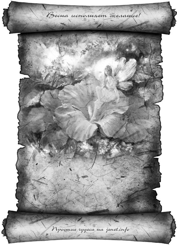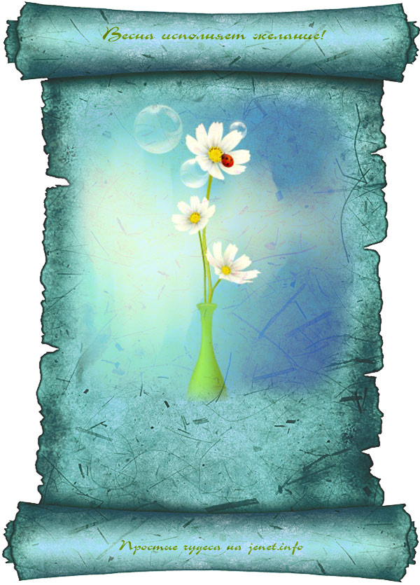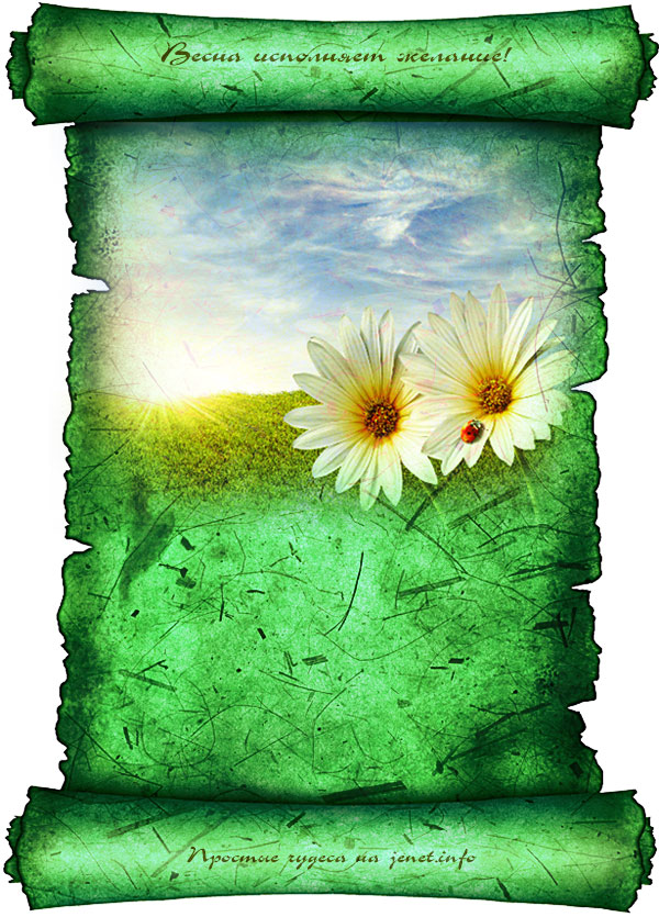 — Взять чистый лист, нарисовать любую весеннюю картинку, подписать ее примерно так: «Открытка, исполняющая жаление», записать на ней свое желание. Для зарядки — держать одну ночь под лунным светом (на растущей луне). Повесить на видном месте или сохранить под матрасом.