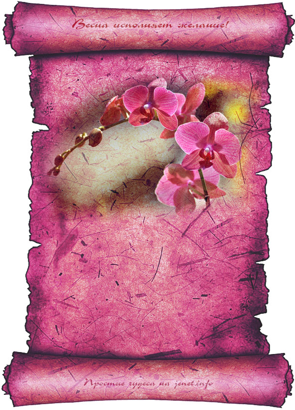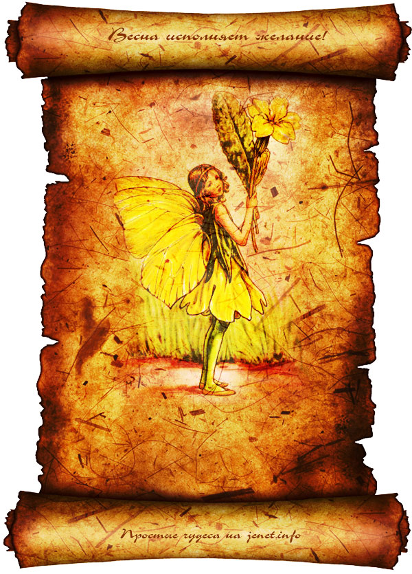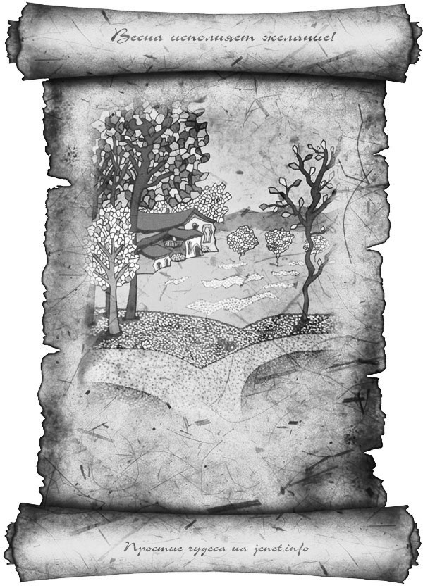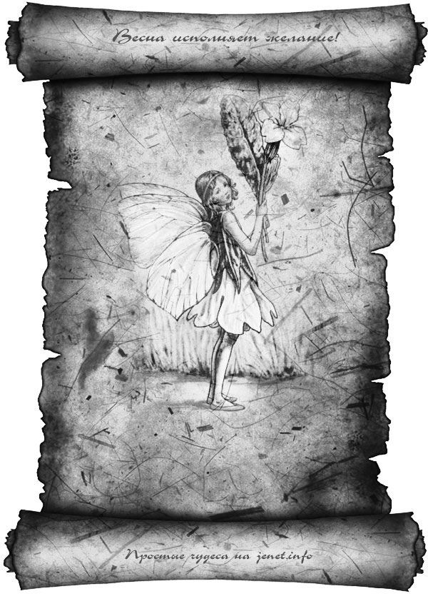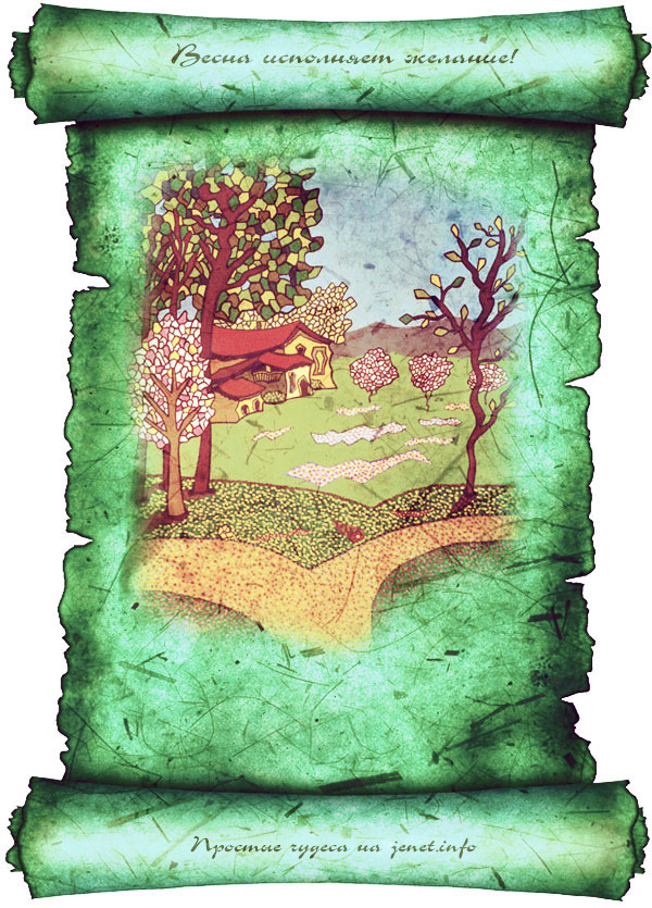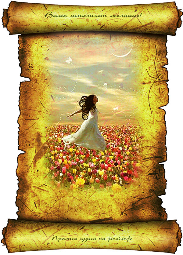 — Взять чистый лист, нарисовать любую весеннюю картинку, подписать ее примерно так: «Открытка, исполняющая жаление», записать на ней свое желание. Для зарядки — держать одну ночь под лунным светом (на растущей луне). Повесить на видном месте или сохранить под матрасом.